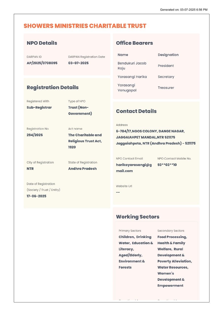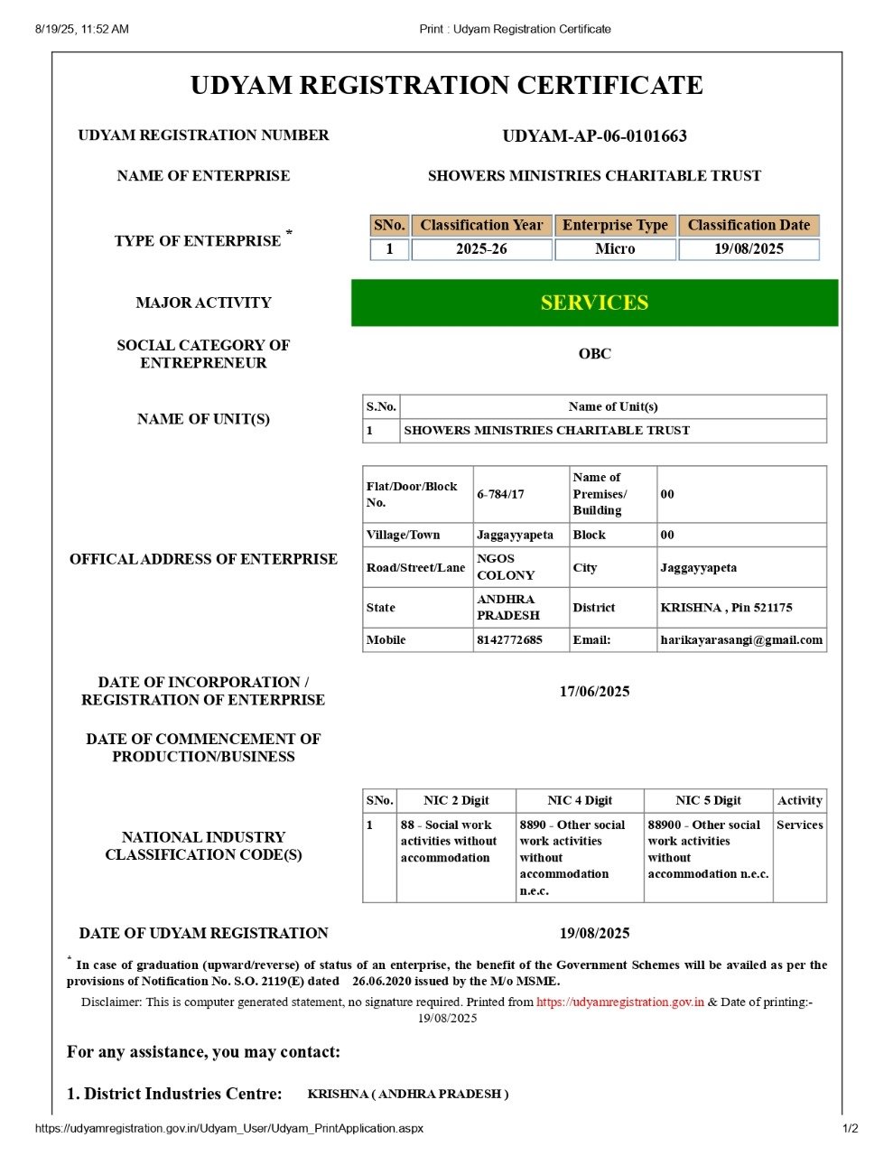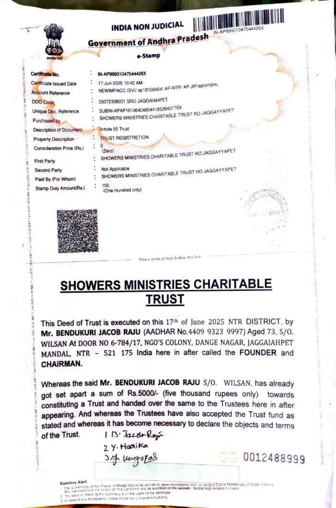 Our organization is led by a visionary leader, Sri. JACOB RAJU BENDUKURI, whose unwavering commitment to our cause has been the driving force behind our success. Established in 2025, since then the organization has been expanding continuously in terms of social and Educational Development and Medical services, Food, and Sheltering for Orphans. It has worked for the promotion of sustainable, equitable, and participatory development, social welfare, and social justice through Programs for social work, the Establishment of Educational Technical and Medical Institutes supportive relief and education to the people, Health services, and other human service through social research and dissemination of socially relevant knowledge, social intervention through training and field action, contribution to social and welfare policy and program at State, National and International levels, over the years, The organization has among others (NGOs, Trusts) thrusts made A significant contribution to planning, action strategies, and Human Resource Development in several areas, ranging from sustainable rural and urban development to education, health, Agriculture, and Human Rights, in all case, the focus has been on the disadvantaged and marginalized section of societies, such as women, children and tribal. At SHOWER MINISTRIES CHARITABLE TRUST , we envision a world where education is a fundamental right for all. Since our inception in [2025], we have been dedicated to breaking down barriers to education, especially for marginalized and disadvantaged communities. Through our school-building initiatives, scholarship programs, and teacher training, we are working towards creating a brighter future for children and youth, empowering them with the knowledge and skills they need to succeed.
